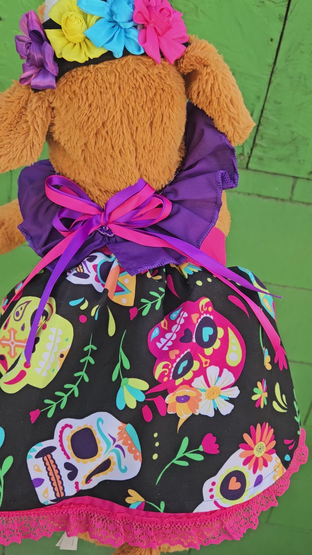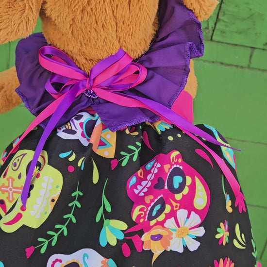 Celebrate the traditional Dia de Muertos with your beloved pet in this beautiful and colorful pet dress. Perfect for adding a festive touch to your furry friend's wardrobe. Expertly crafted to showcase the vibrant and unique aesthetic of this special celebration.
